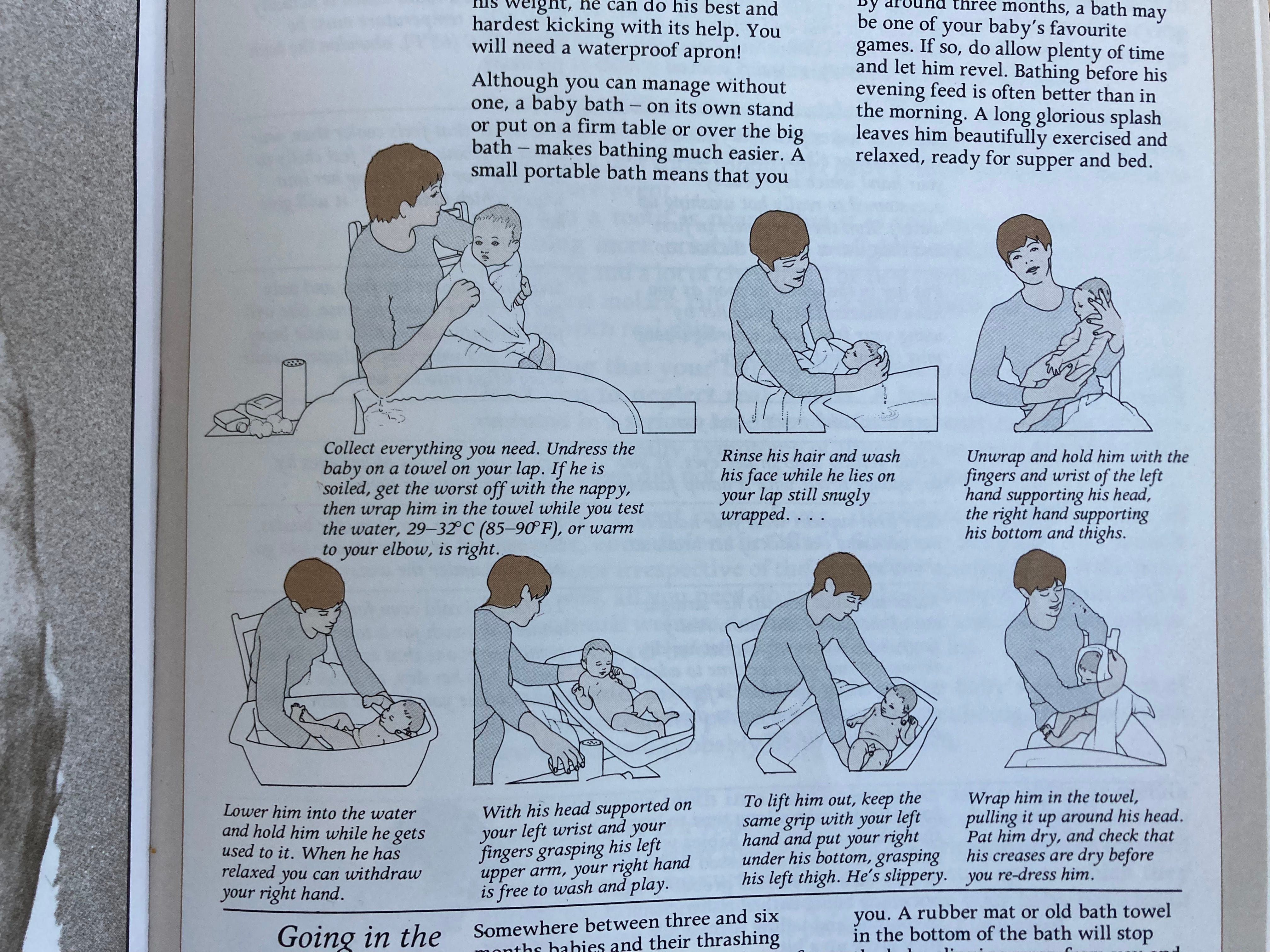 This isn’t just mine, the problem of my personal missing archive. It’s the whole challenge of doing the history of care work and the history of childhood. We have access to expert texts, like Leach’s, and we can know if people bought them. These texts might shape big decisions you make as a parent or experiences you have as a child. (Childminder or nursery, for example, is something that Penelope Leach has views on.) But parenting, like all interpersonal relationships, are a series of rapid-fire micro decisions and interactions. These can’t be captured by advice on how you ought to parent. More, infant care work, historically women’s work, is by its nature self-obliterating: the baby is hungry again, the nappy is wet again, the baby is awake again. There is no product, the labour disappears. Feeding, changing, shhh-ing, the stuff of cabbages and habits, is rarely written down.[4]Leach does capture some of the mechanics of this labour, but already her how-to diagrams of washing a newborn baby feel removed from anything I have ever participated in, as either washer or washed.
